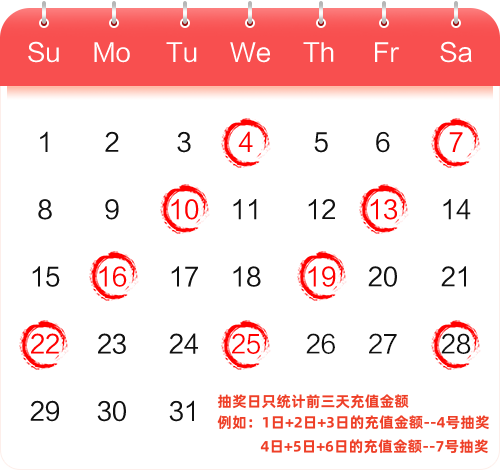 3、活动抽奖时间:固定每月4-7-10-13-16-19-22-25-28号为抽奖日(28-29-30-31日不列入统计)每个抽奖日晚上19:00开启奖池抽奖